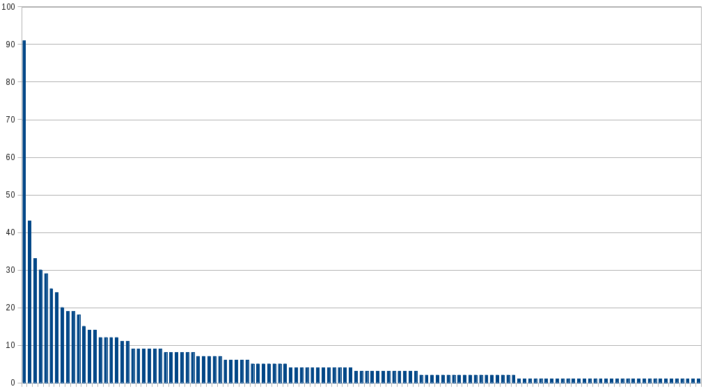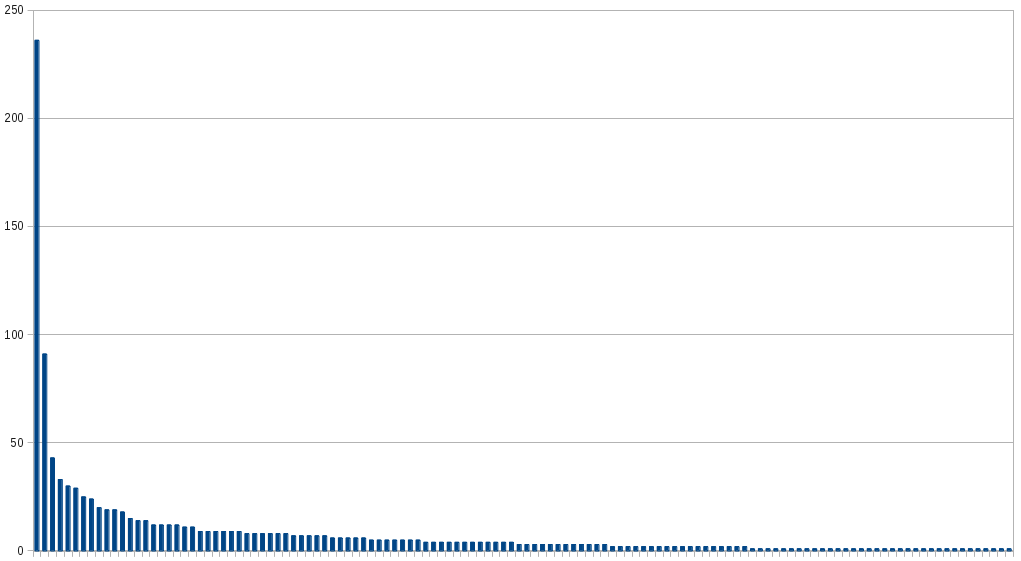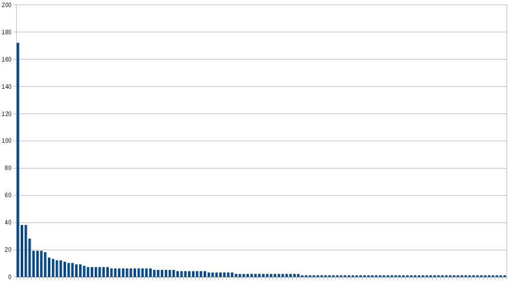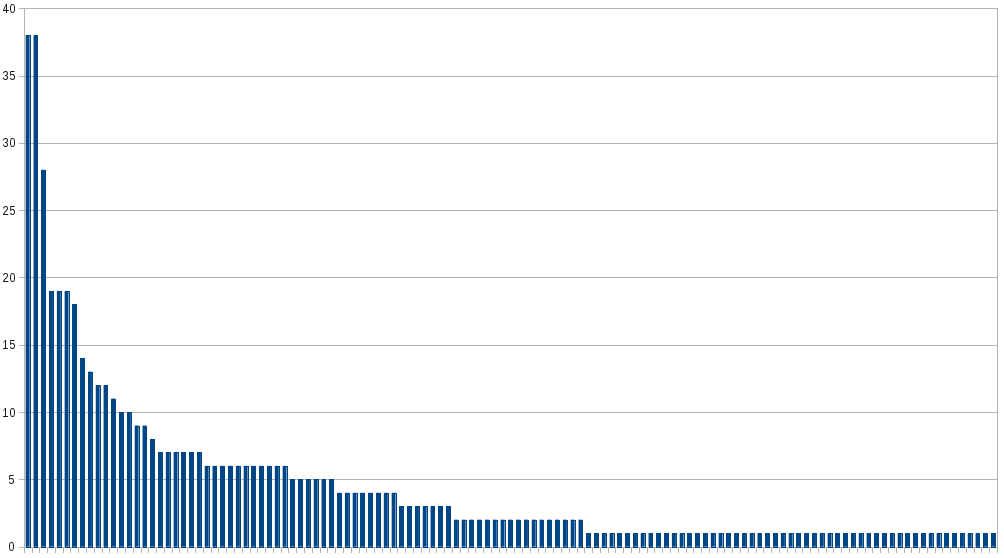 That looks pretty good! But wait, there is a catch. One user who edits the same event 5 times will have a higher count in this data, and you could argue that's not a fair representation. Ok - let's get a graph of each user and how many events they have edited.